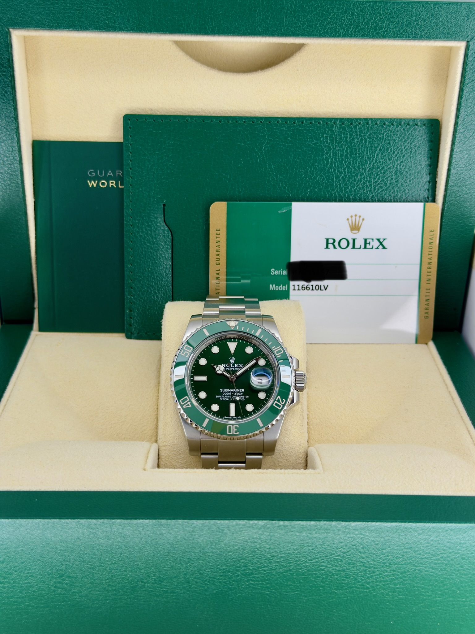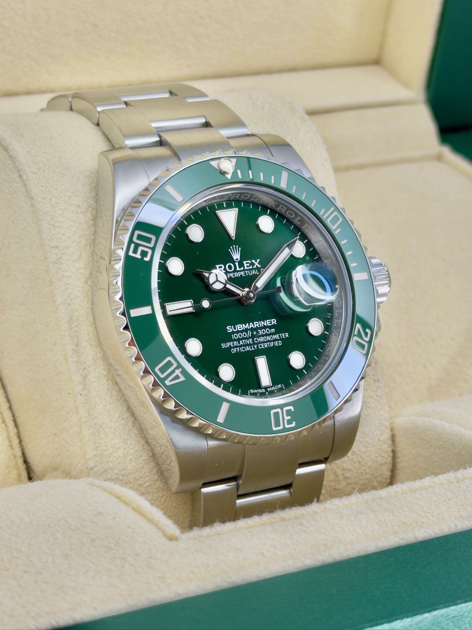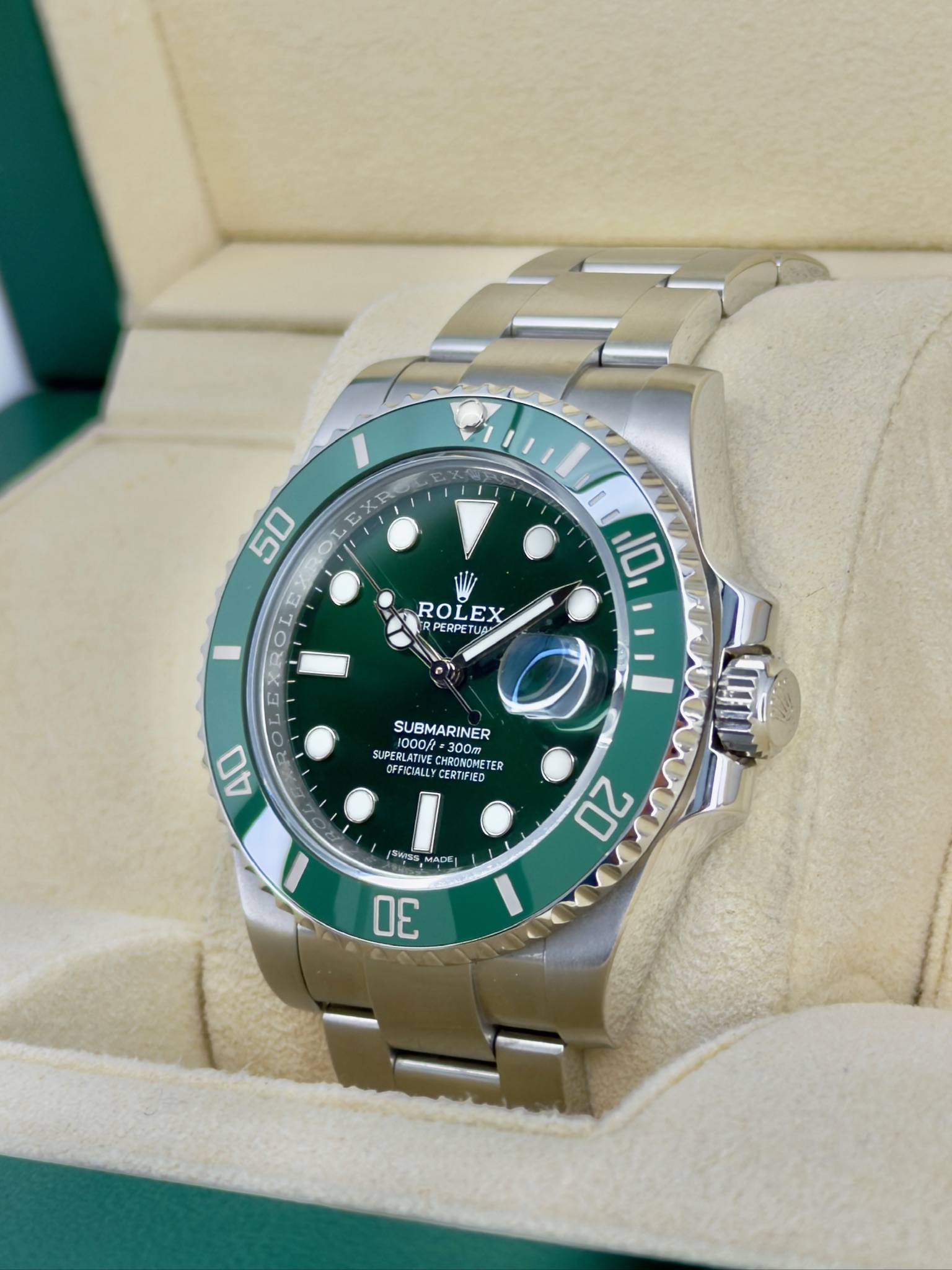This pre-owned Rolex Submariner 116610LV “Hulk” is one of those watches you spot immediately. The bright green dial and matching green ceramic bezel give it a bold, standout look, but it’s still the classic Submariner underneath. Built in stainless steel, it’s rugged, reliable, and made for serious dive performance, though most people wear it as an everyday statement piece. It comes with box and papers, which adds extra value for collectors. Overall, it’s sporty, eye-catching, and just an all-around iconic Rolex that works with pretty much anything you wear.
