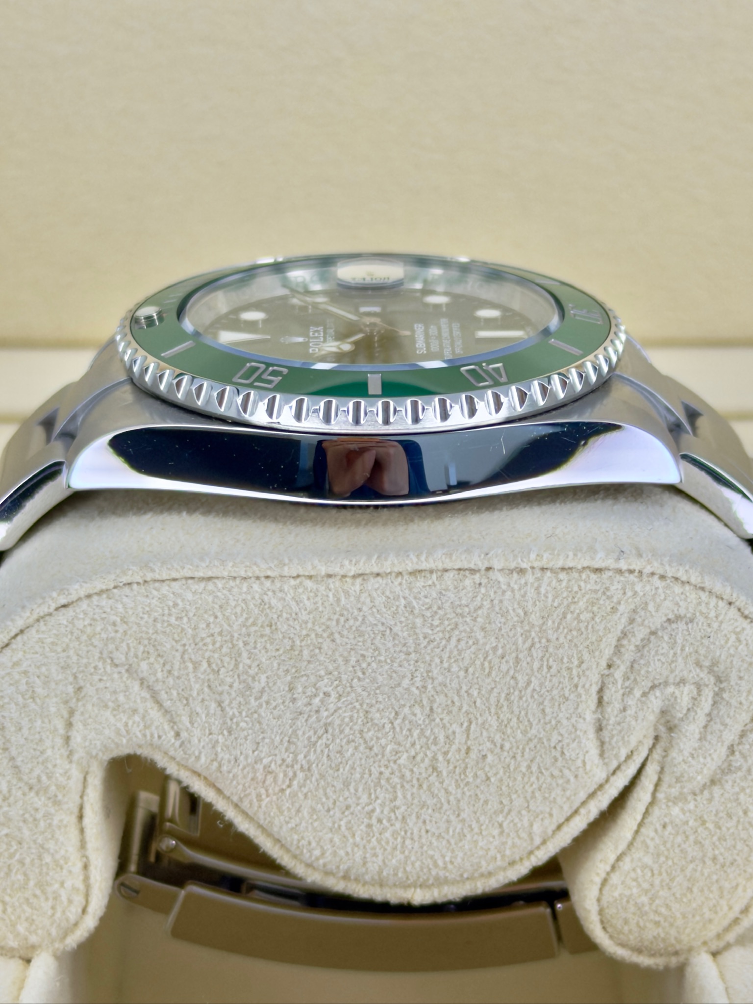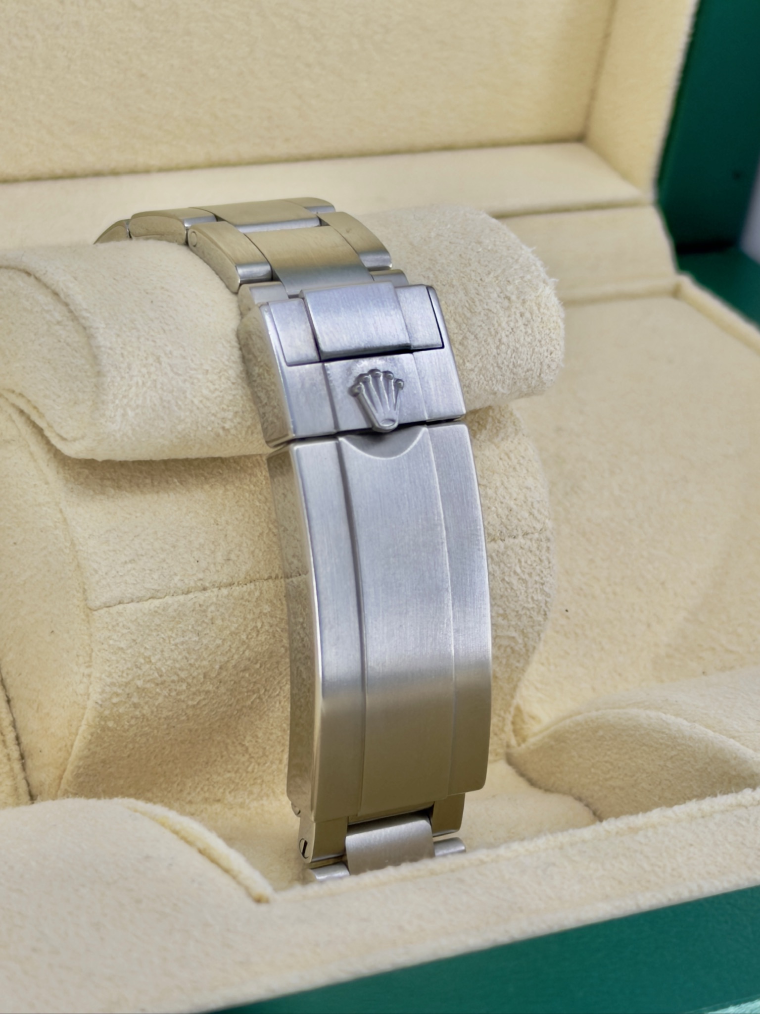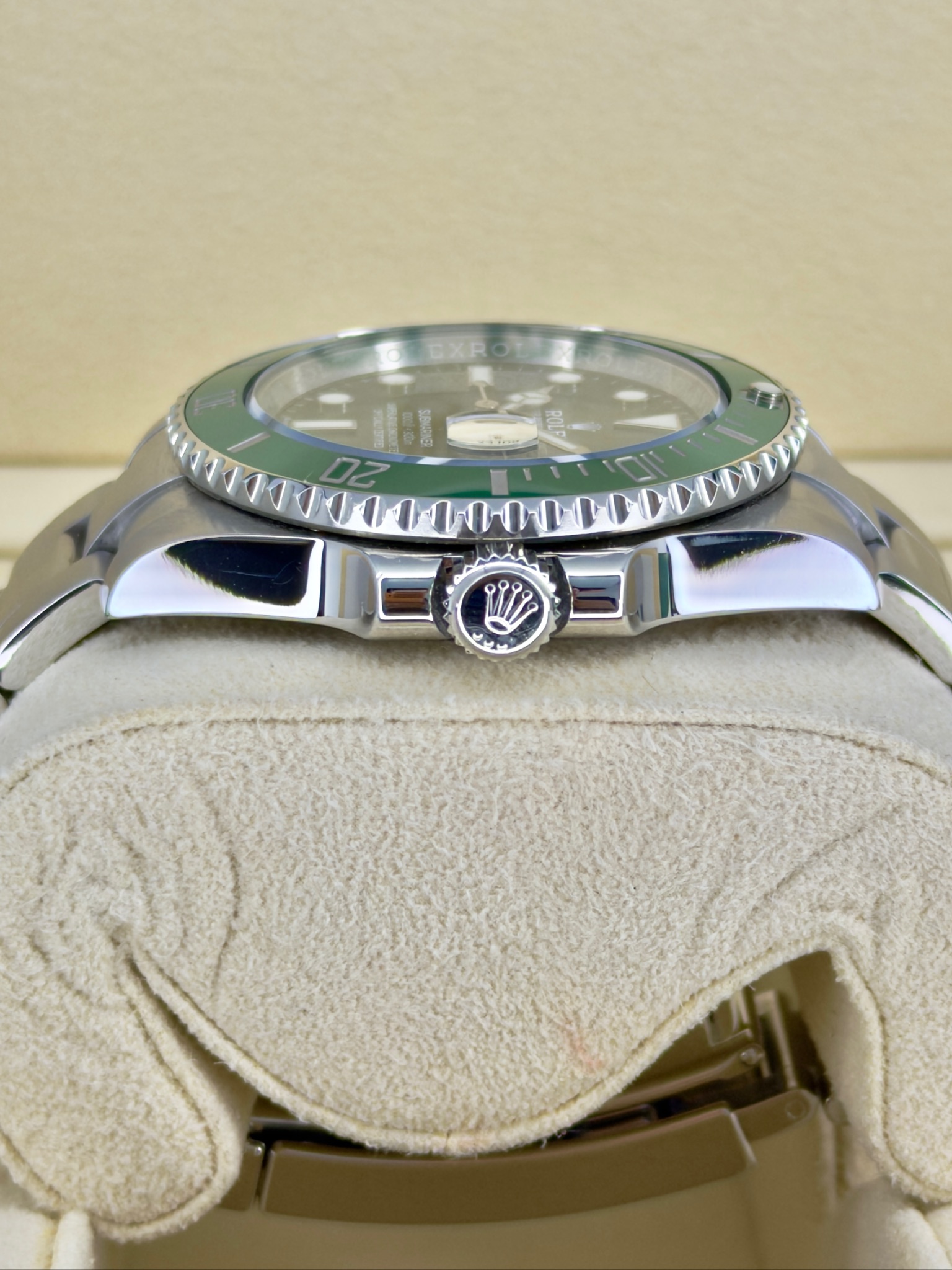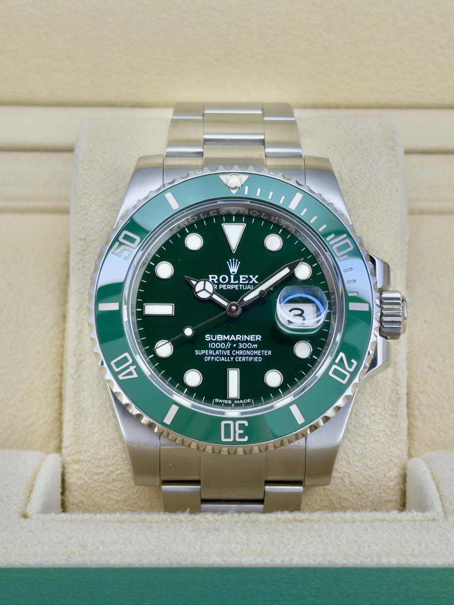 This pre-owned Rolex Submariner 116610LV “Hulk” is one of those watches you spot immediately. The bright green dial and matching green ceramic bezel give it a bold, standout look, but it’s still the classic Submariner underneath. Built in stainless steel, it’s rugged, reliable, and made for serious dive performance, though most people wear it as an everyday statement piece. It comes with box and papers, which adds extra value for collectors. Overall, it’s sporty, eye-catching, and just an all-around iconic Rolex that works with pretty much anything you wear.