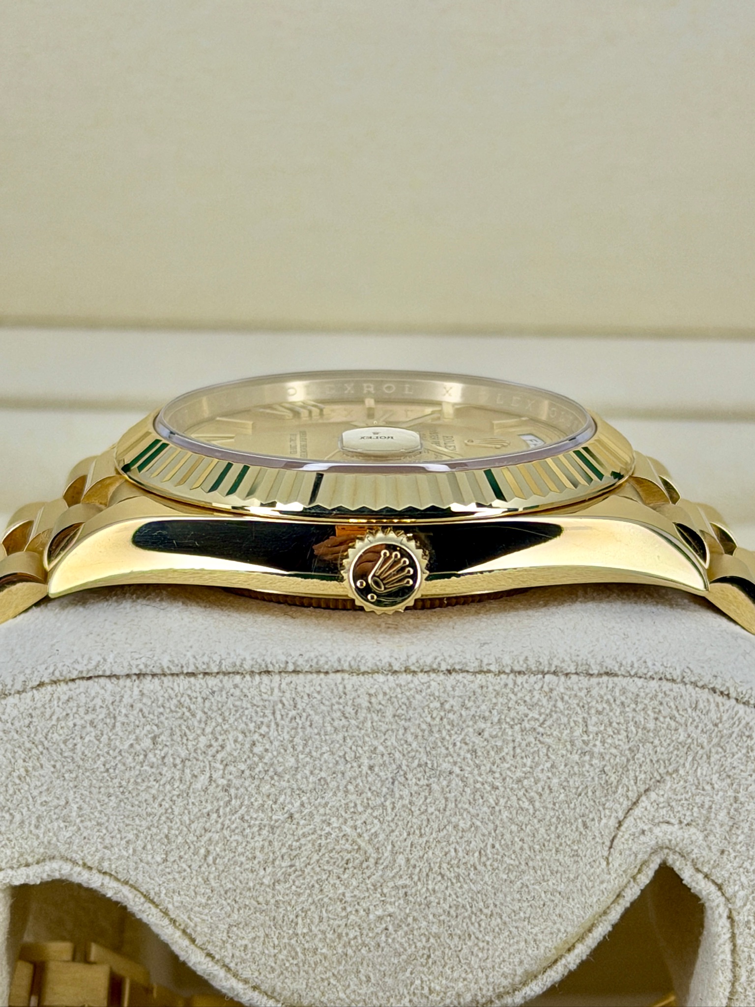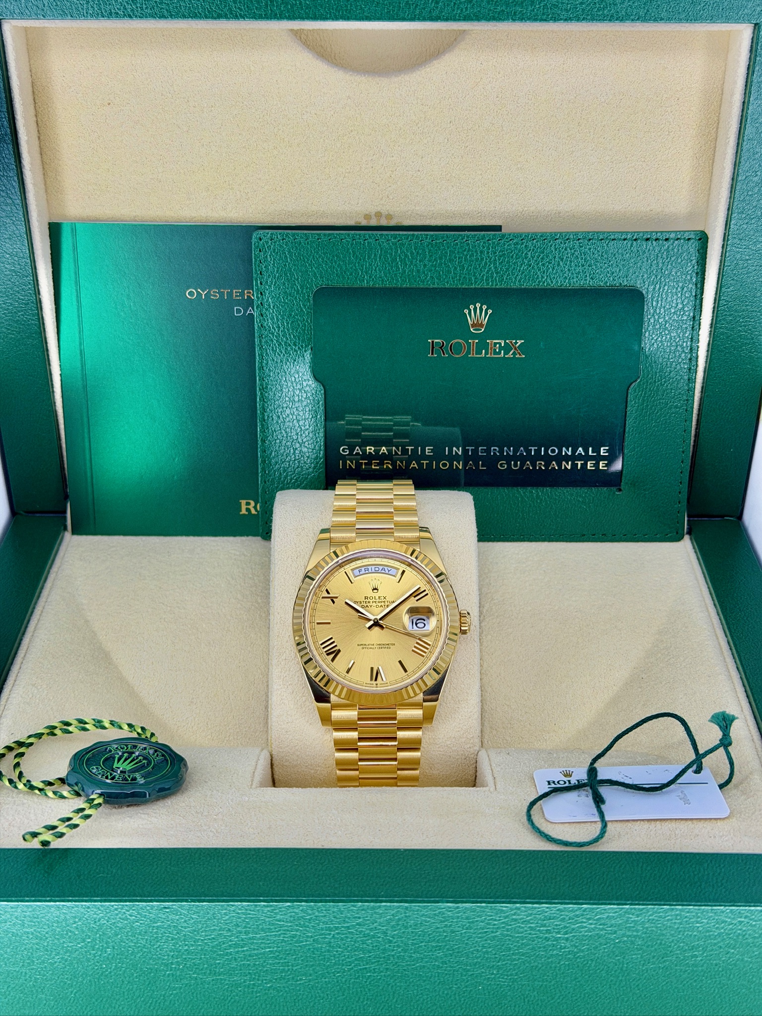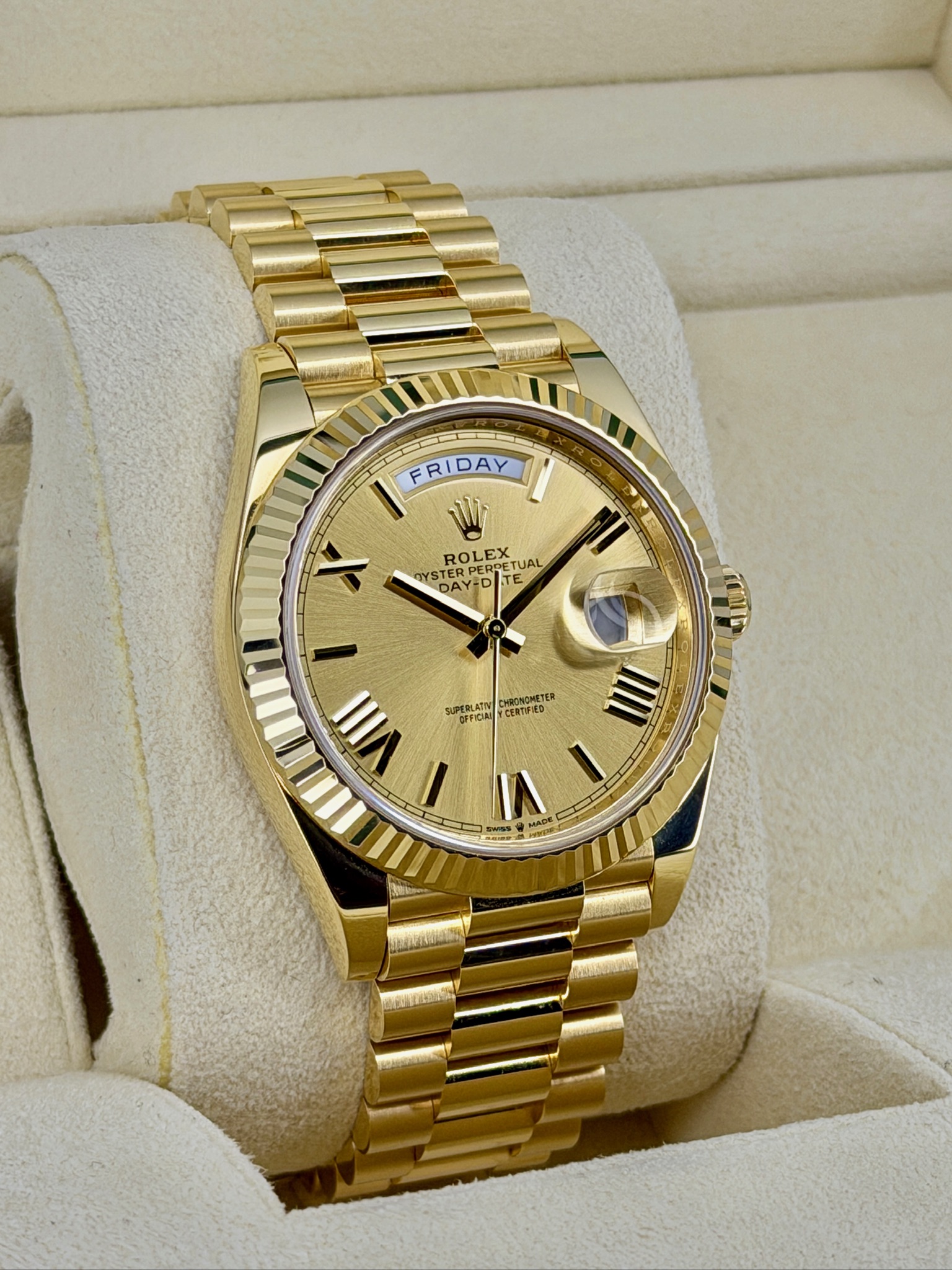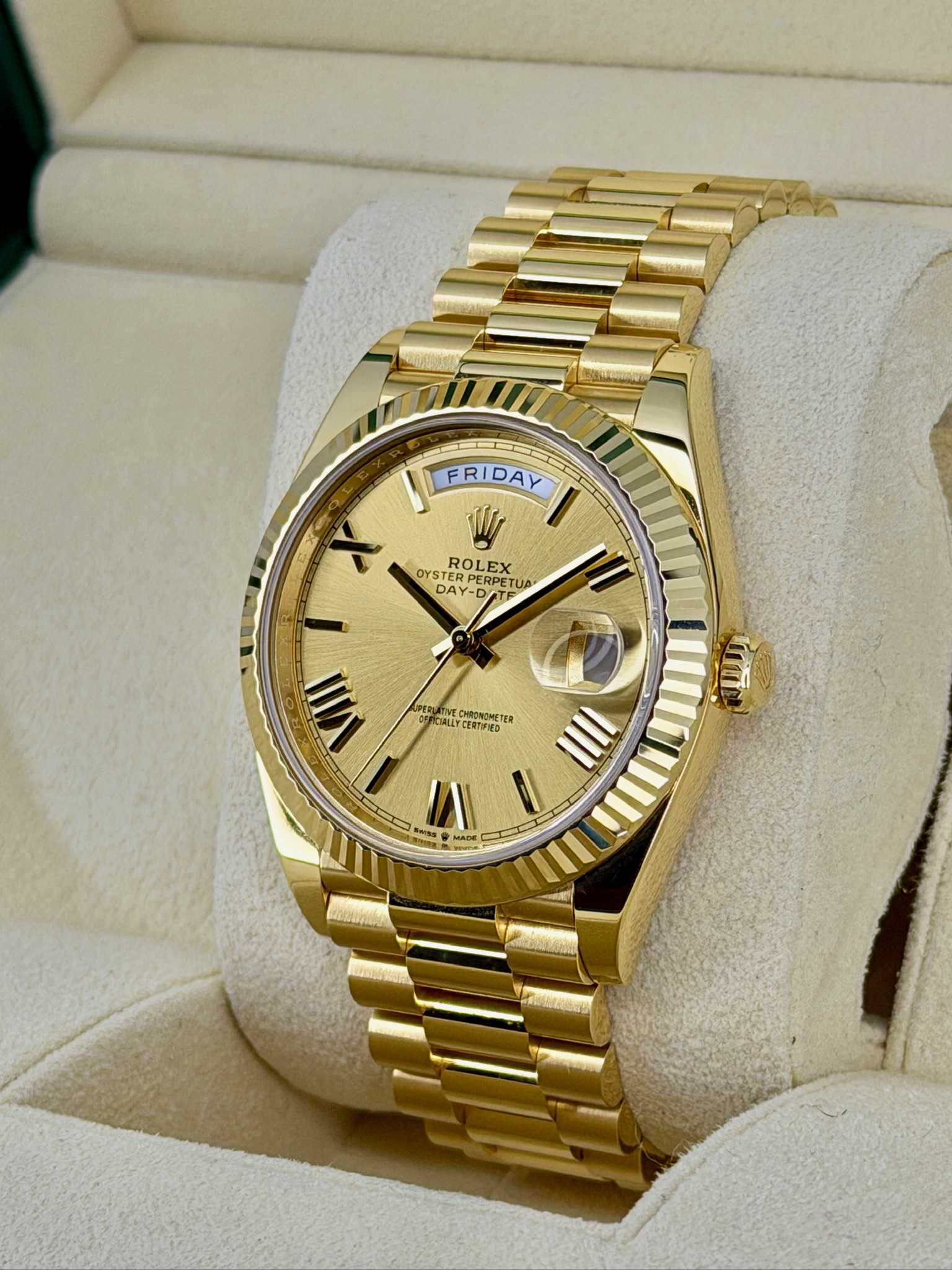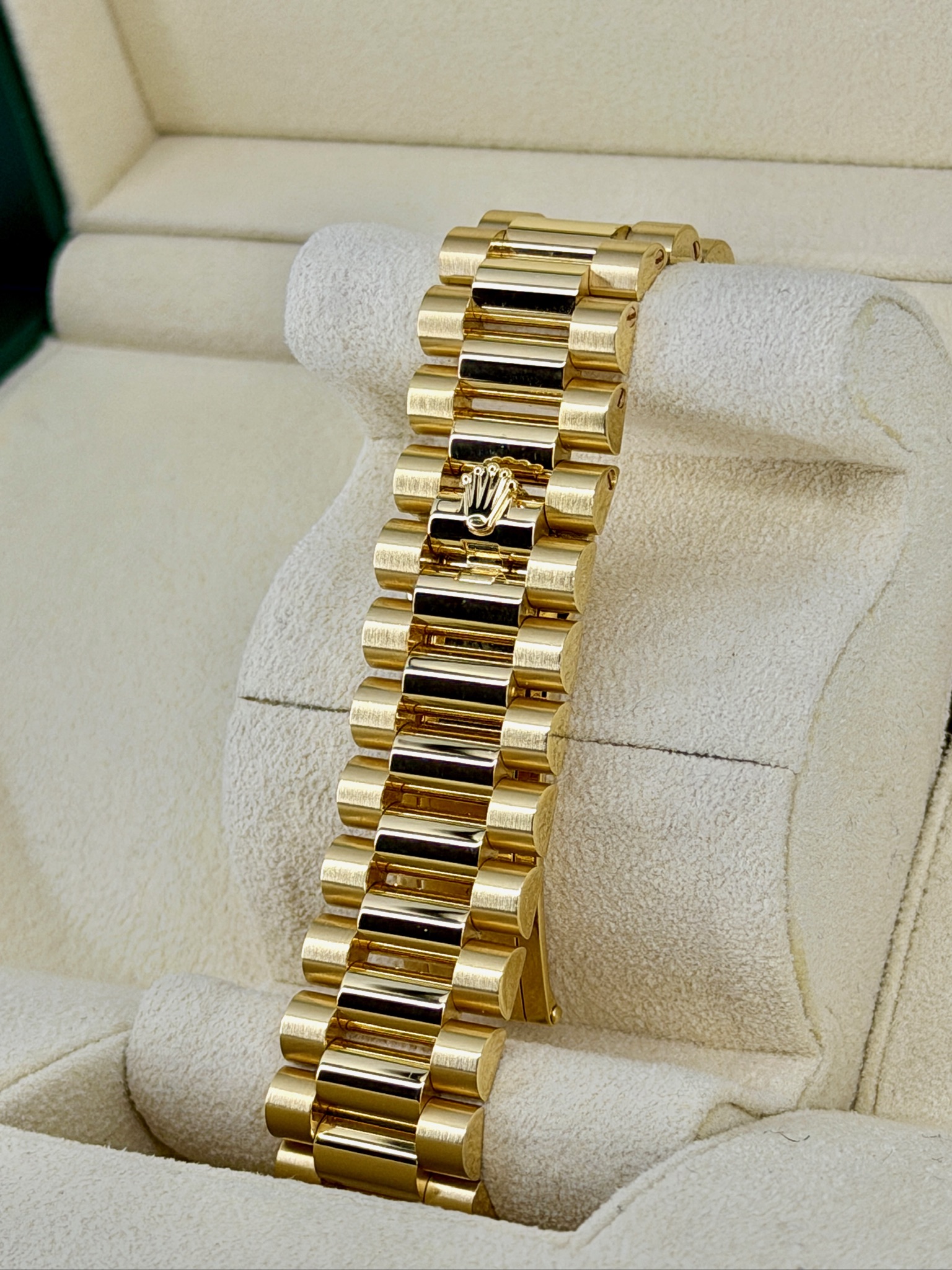 This Rolex Day-Date 228238 is one of those watches that instantly feels special the moment you put it on. Crafted in solid 18k yellow gold, it has a confident weight and timeless presence without being over the top. The President bracelet is incredibly comfortable and gives it that classic Rolex look everyone recognizes. The day and date display is clean, practical, and iconic. Powered by Rolex’s automatic movement, it’s built for everyday wear and long-term reliability—an effortless statement of success and refined taste.
