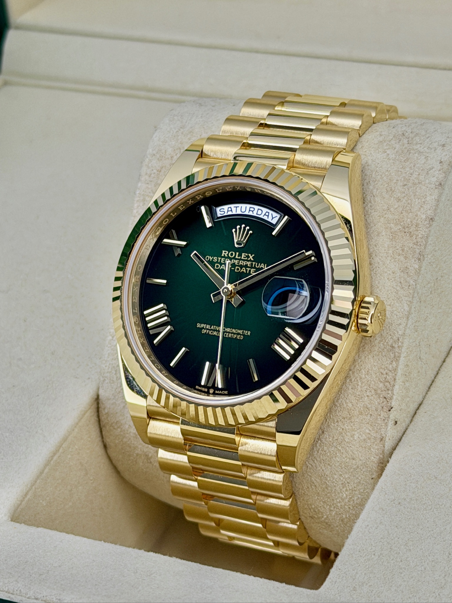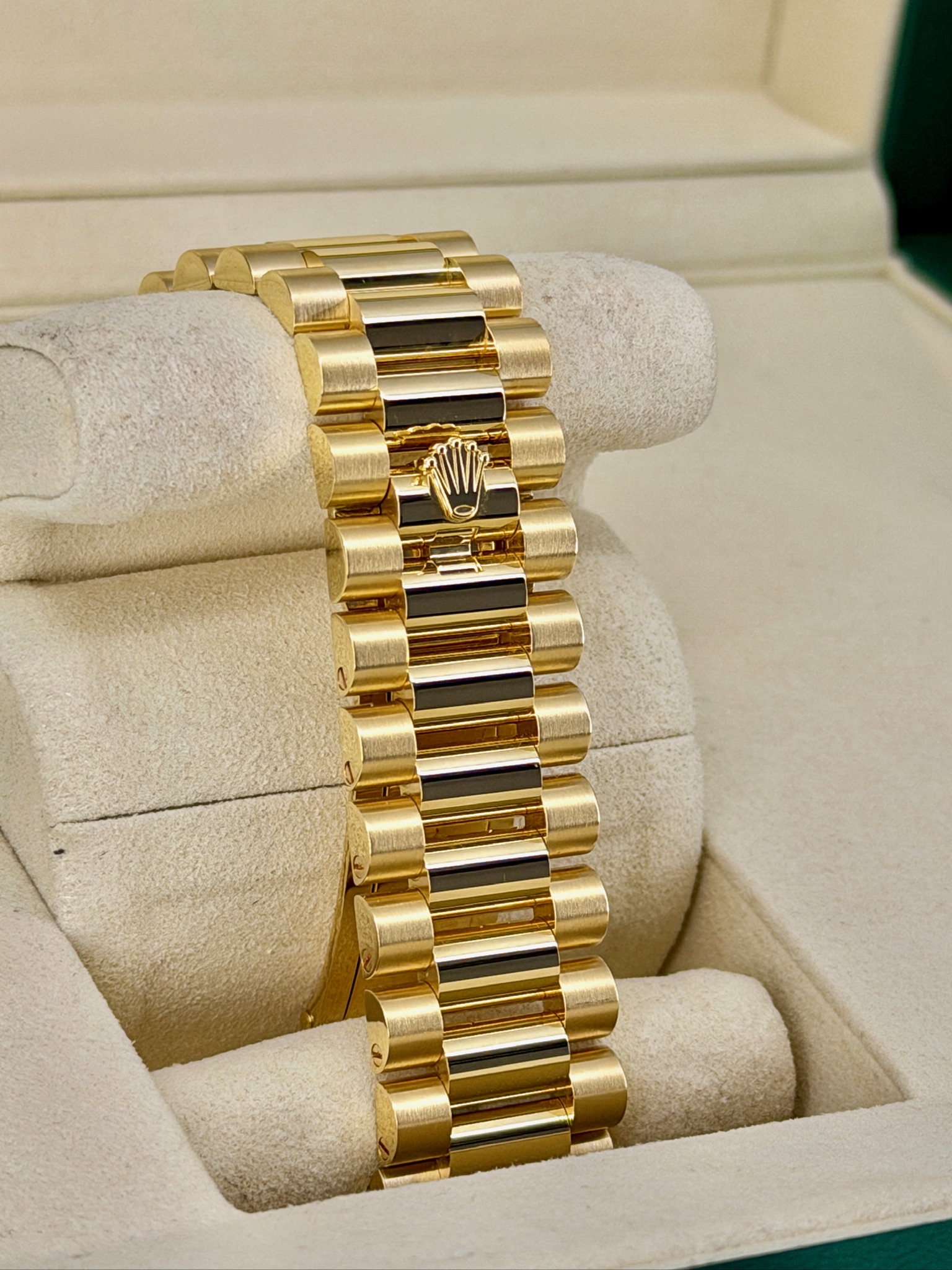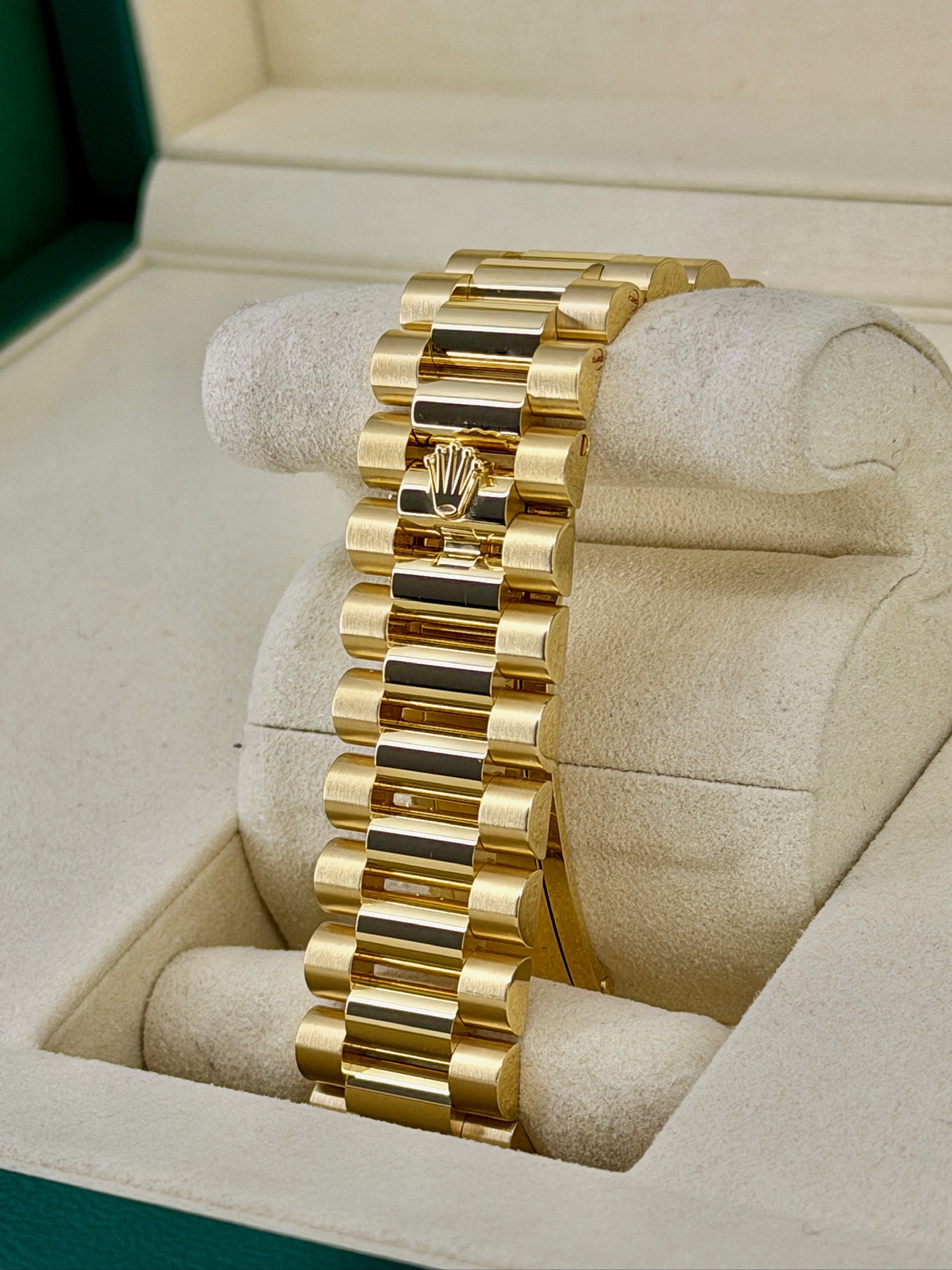 This is a pre-owned Rolex Day-Date 228238 that really stands out. The rich green dial paired with the 18k yellow gold case gives it that classic Rolex look with a bold edge. It’s the iconic Day-Date, so you get both the full day and date display, plus the comfortable President bracelet everyone loves. The 40mm size wears beautifully—substantial but not flashy. It’s a timeless luxury watch that feels just as impressive on the wrist as it looks in person.