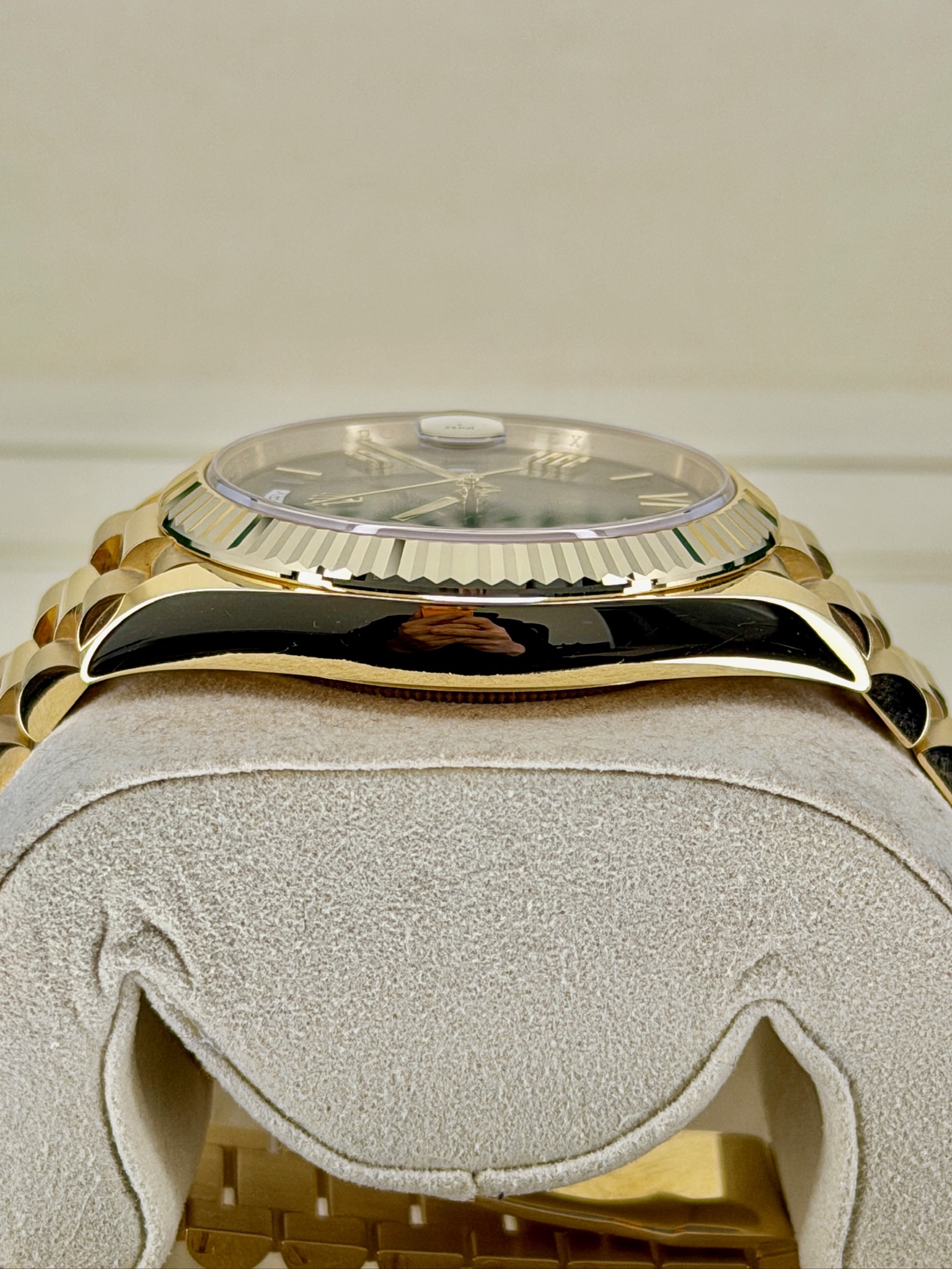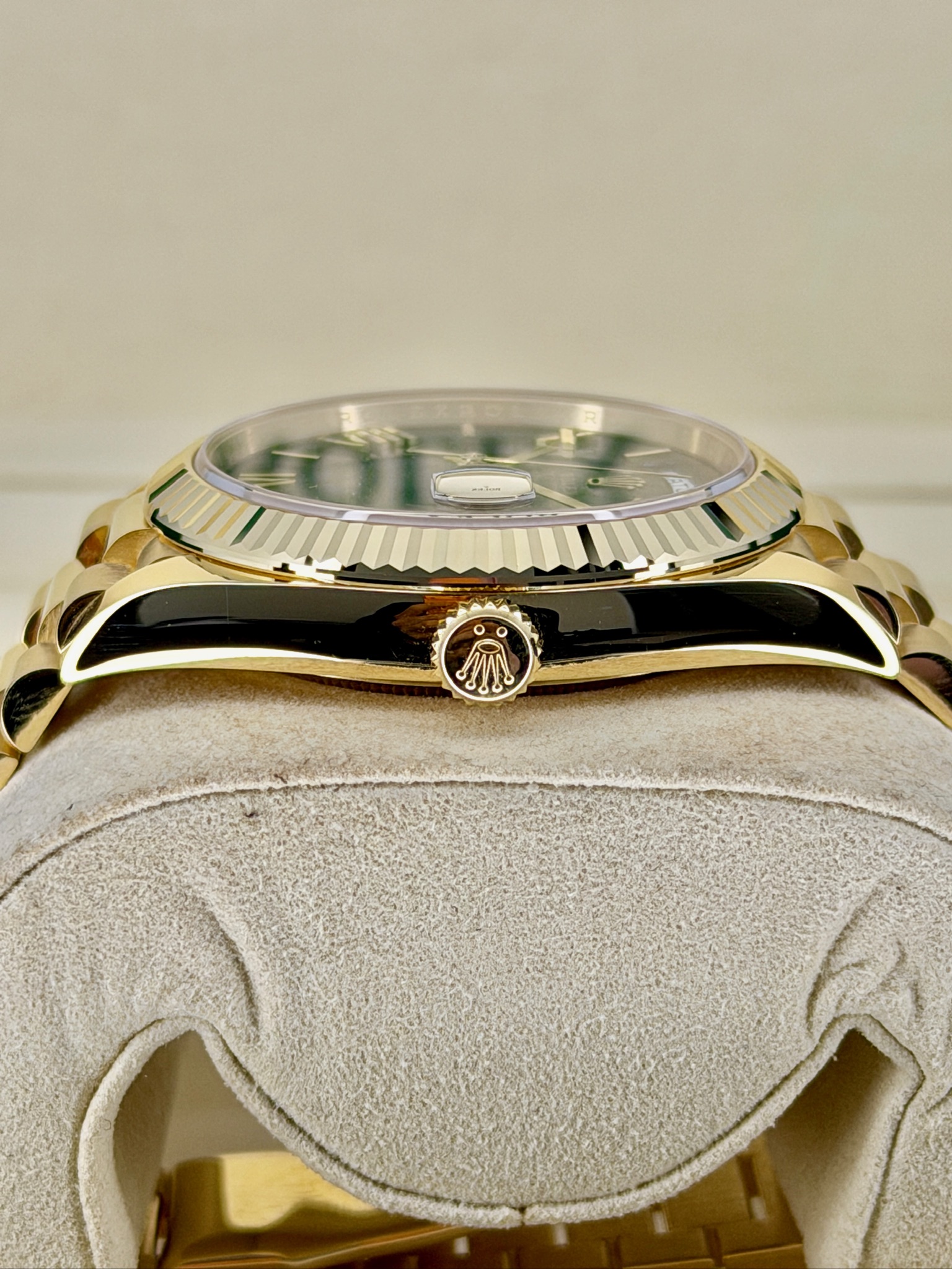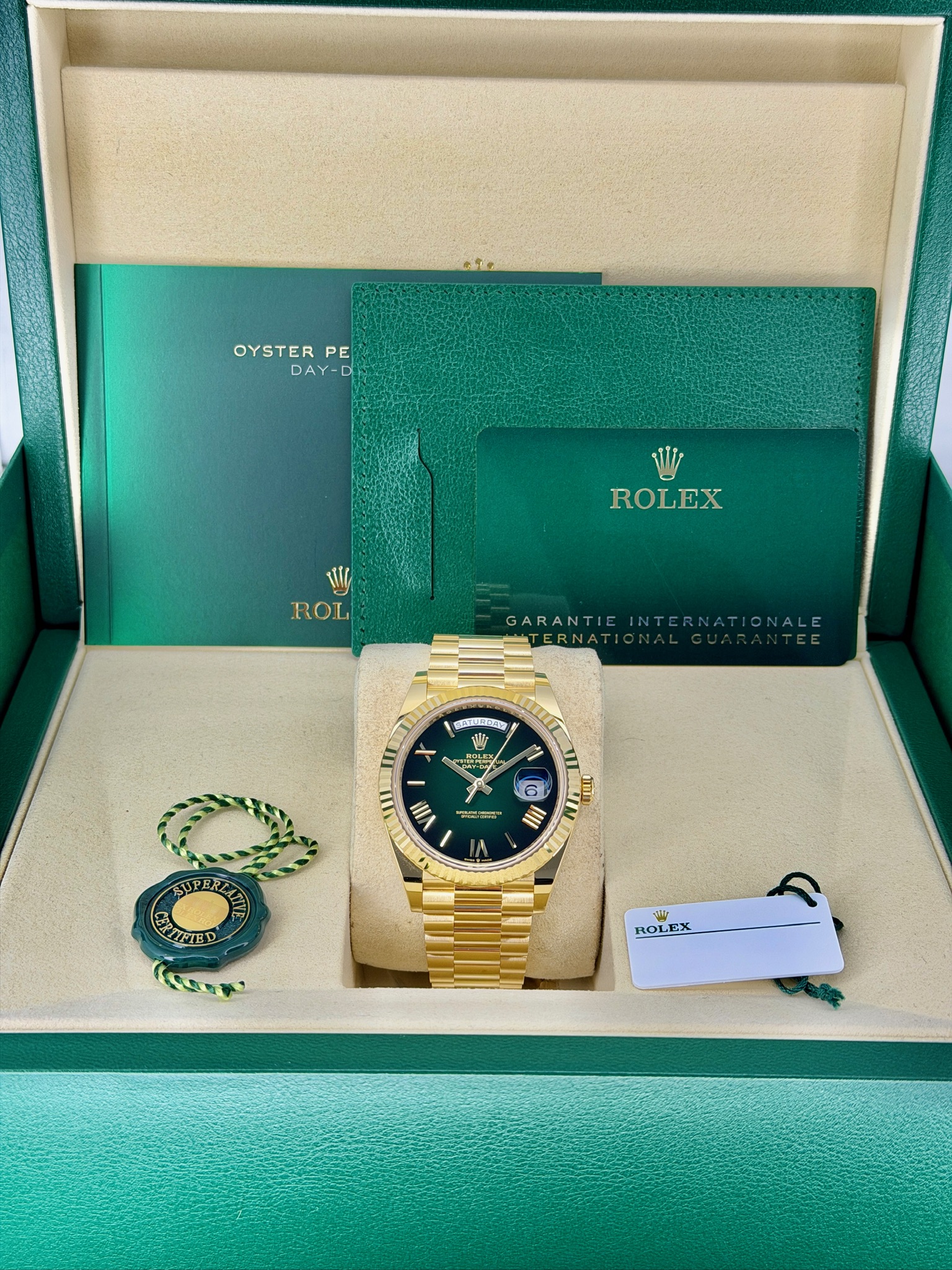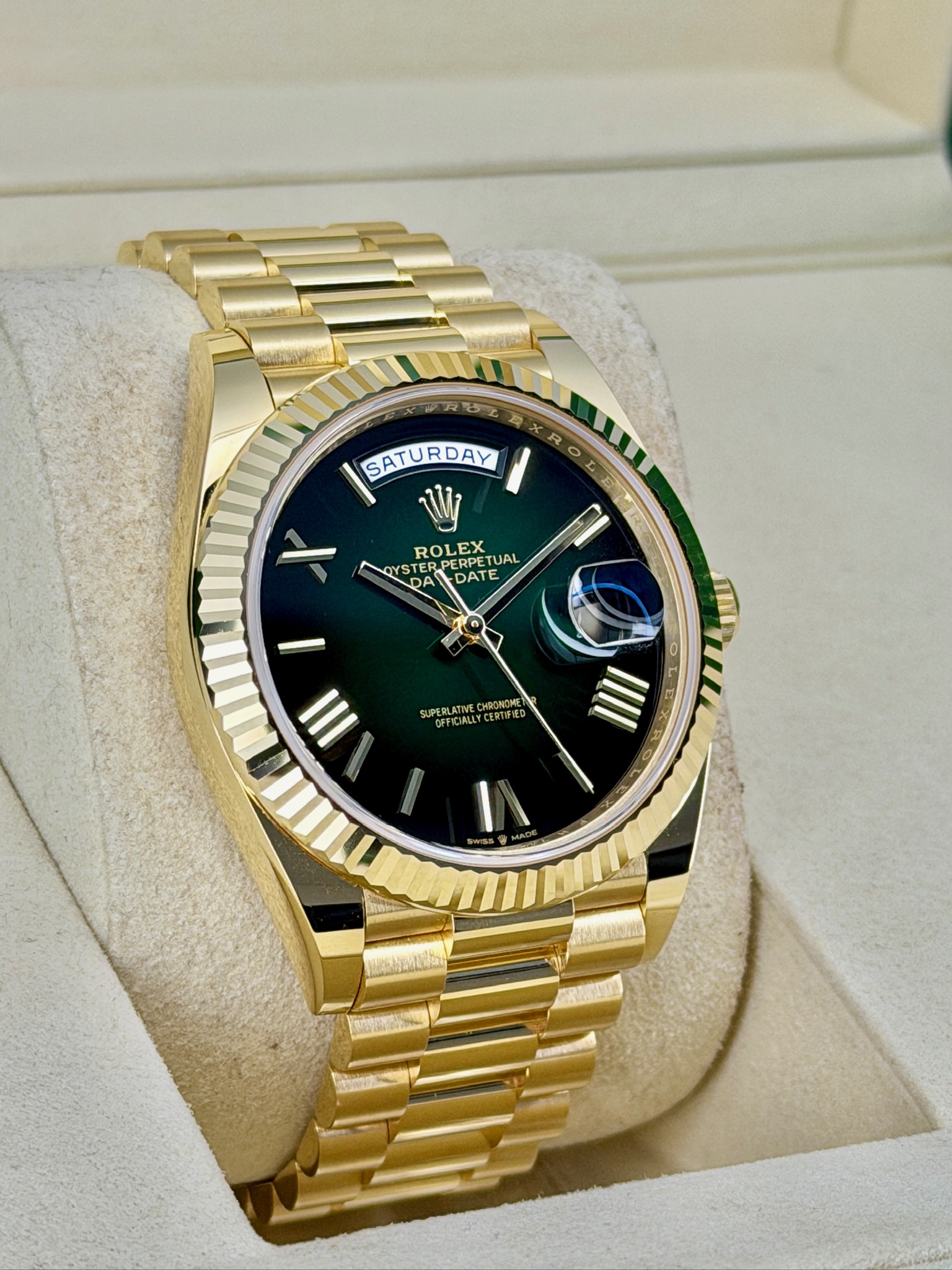 This is a pre-owned Rolex Day-Date 228238 that really stands out. The rich green dial paired with the 18k yellow gold case gives it that classic Rolex look with a bold edge. It’s the iconic Day-Date, so you get both the full day and date display, plus the comfortable President bracelet everyone loves. The 40mm size wears beautifully—substantial but not flashy. It’s a timeless luxury watch that feels just as impressive on the wrist as it looks in person.