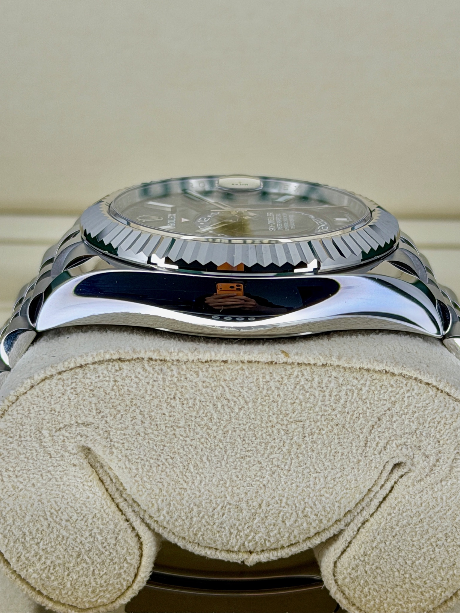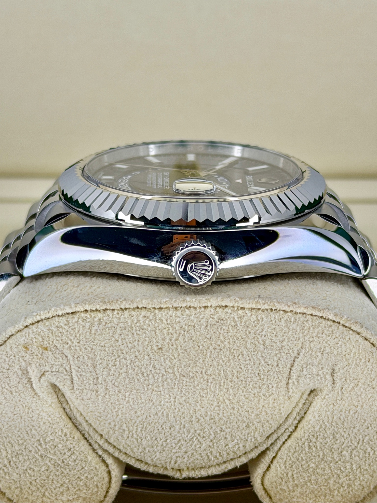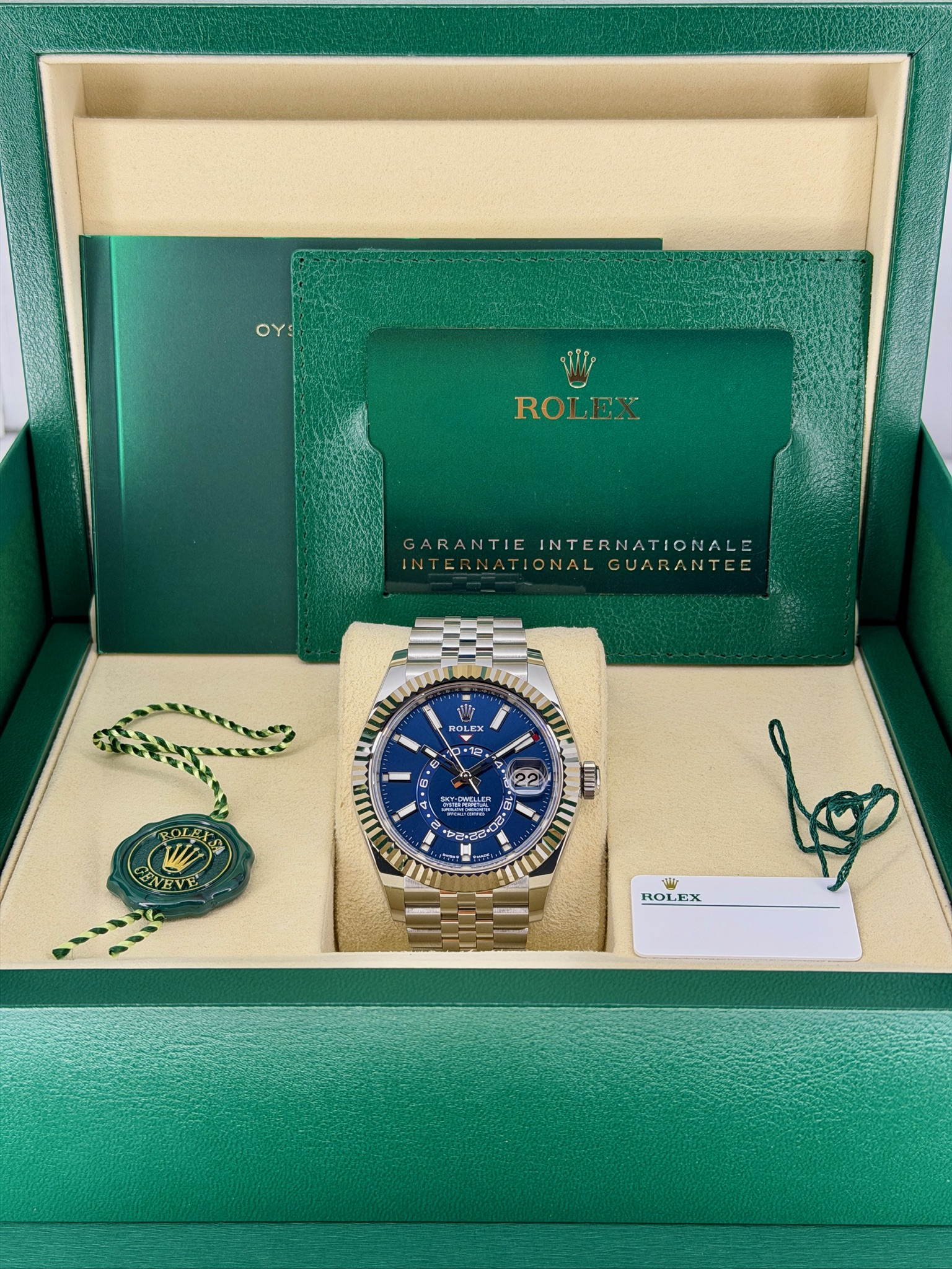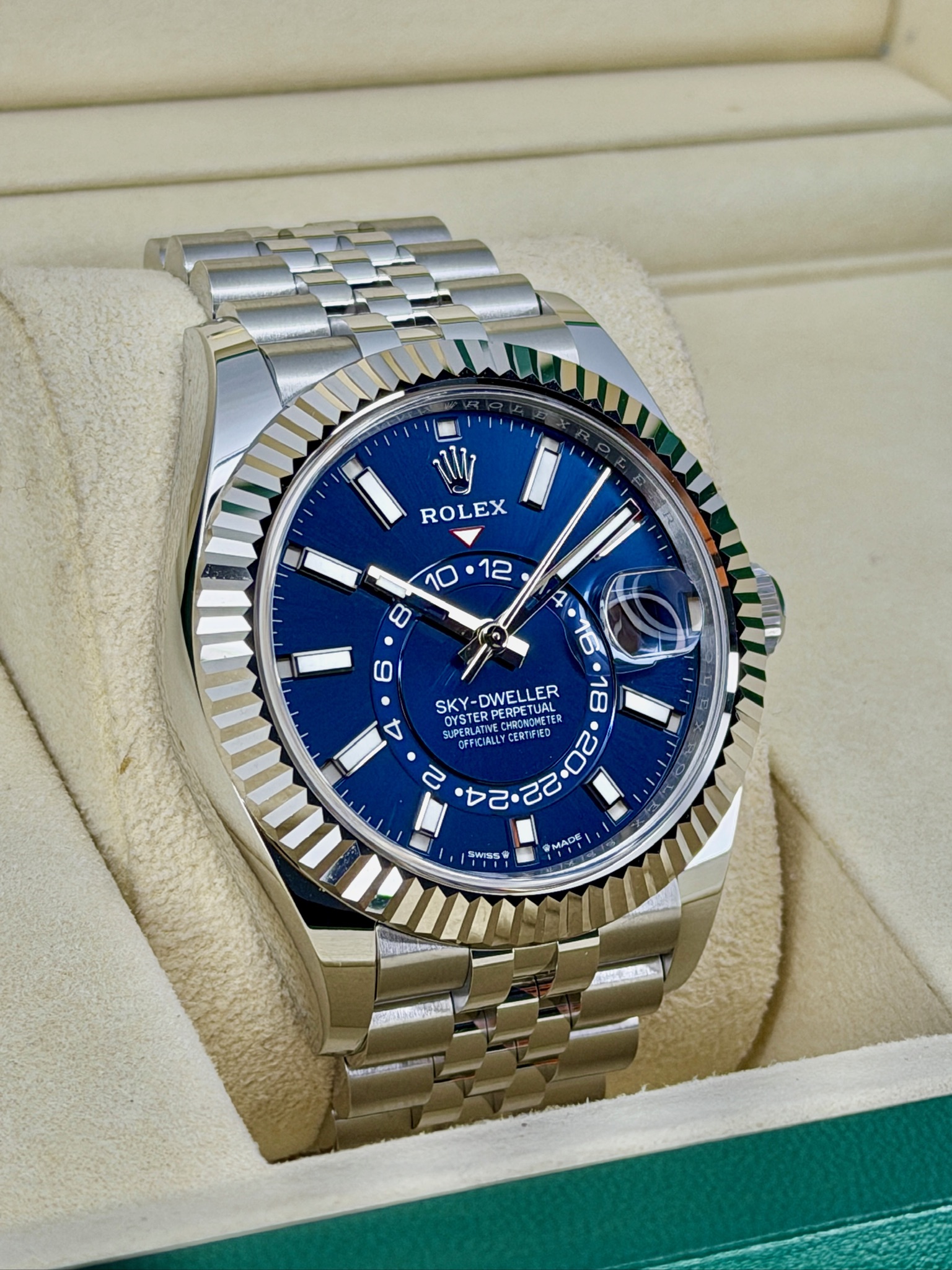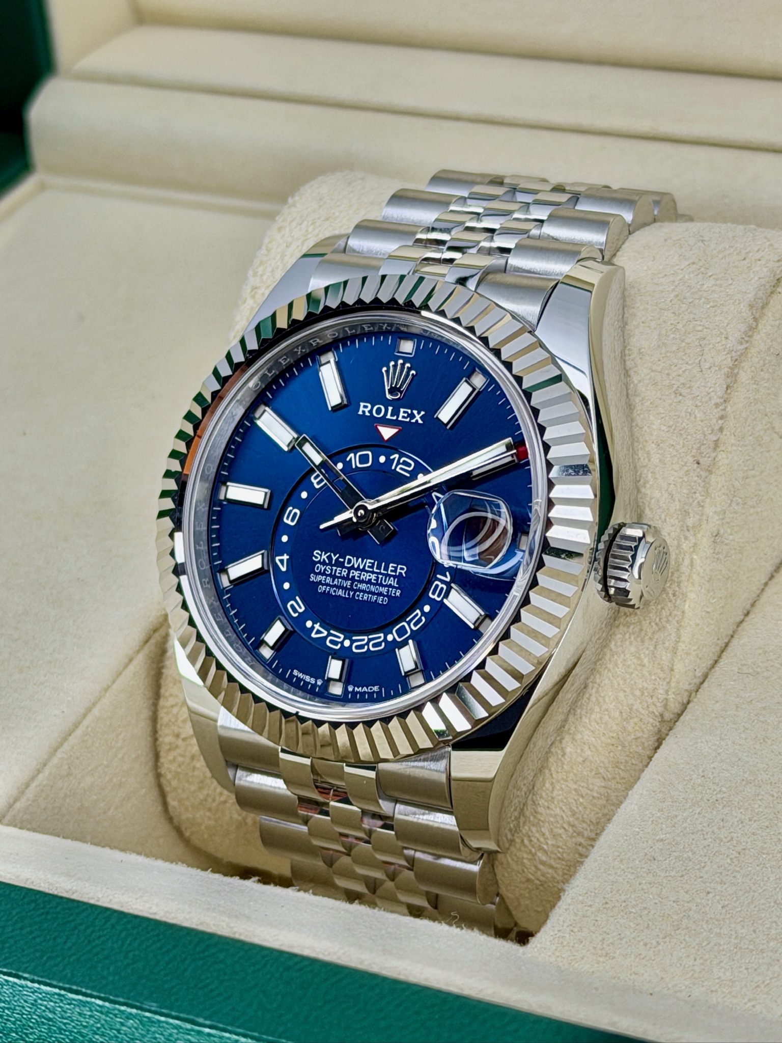 This pre-owned Rolex Sky-Dweller 336934 is a watch built for travelers who love style and functionality. It features a sleek stainless steel case with white gold accents, giving it a modern, polished look. The dual time zone and annual calendar make keeping track of your schedule effortless—perfect if you’re often on the move. Despite all its complications, it wears comfortably and feels surprisingly versatile, looking just as good in a suit as with casual attire. It’s a standout Rolex that combines practicality, luxury, and lasting value in one elegant package.