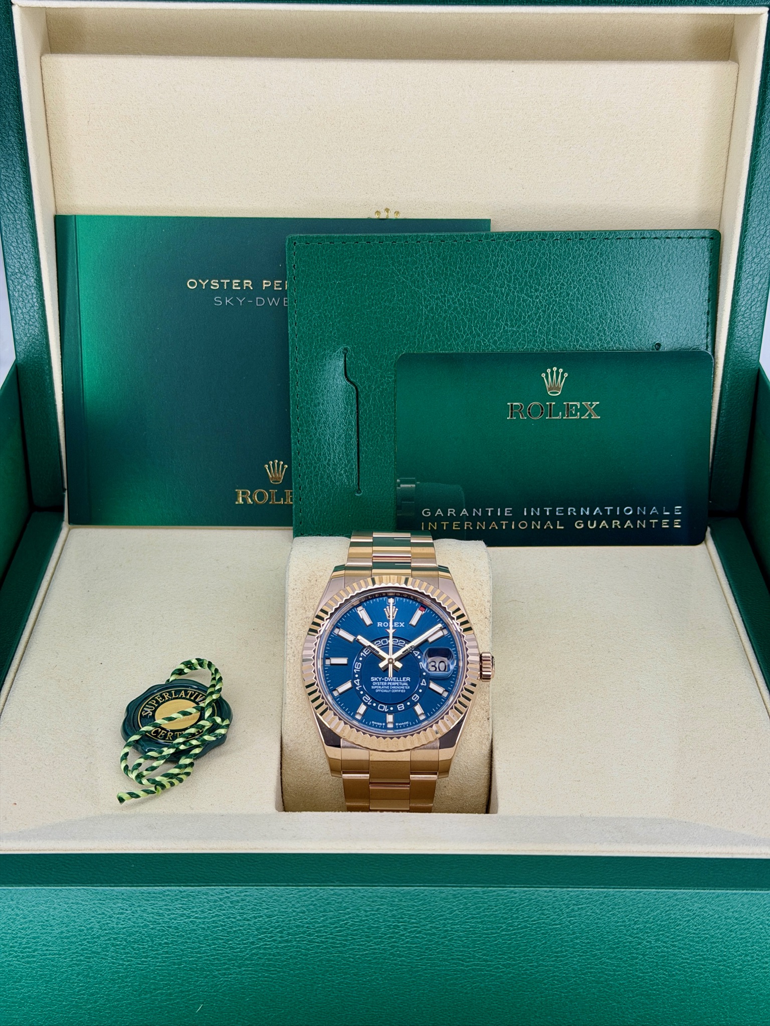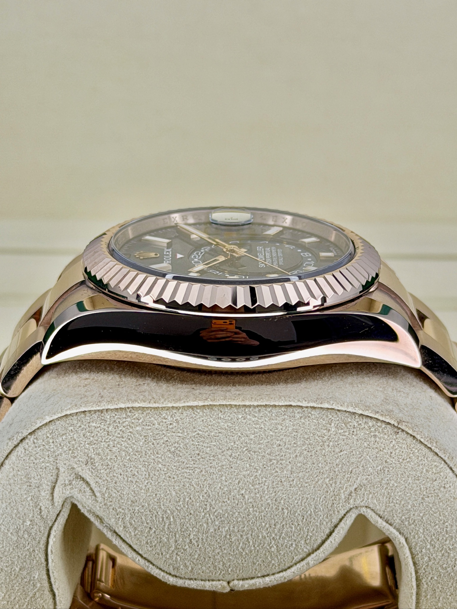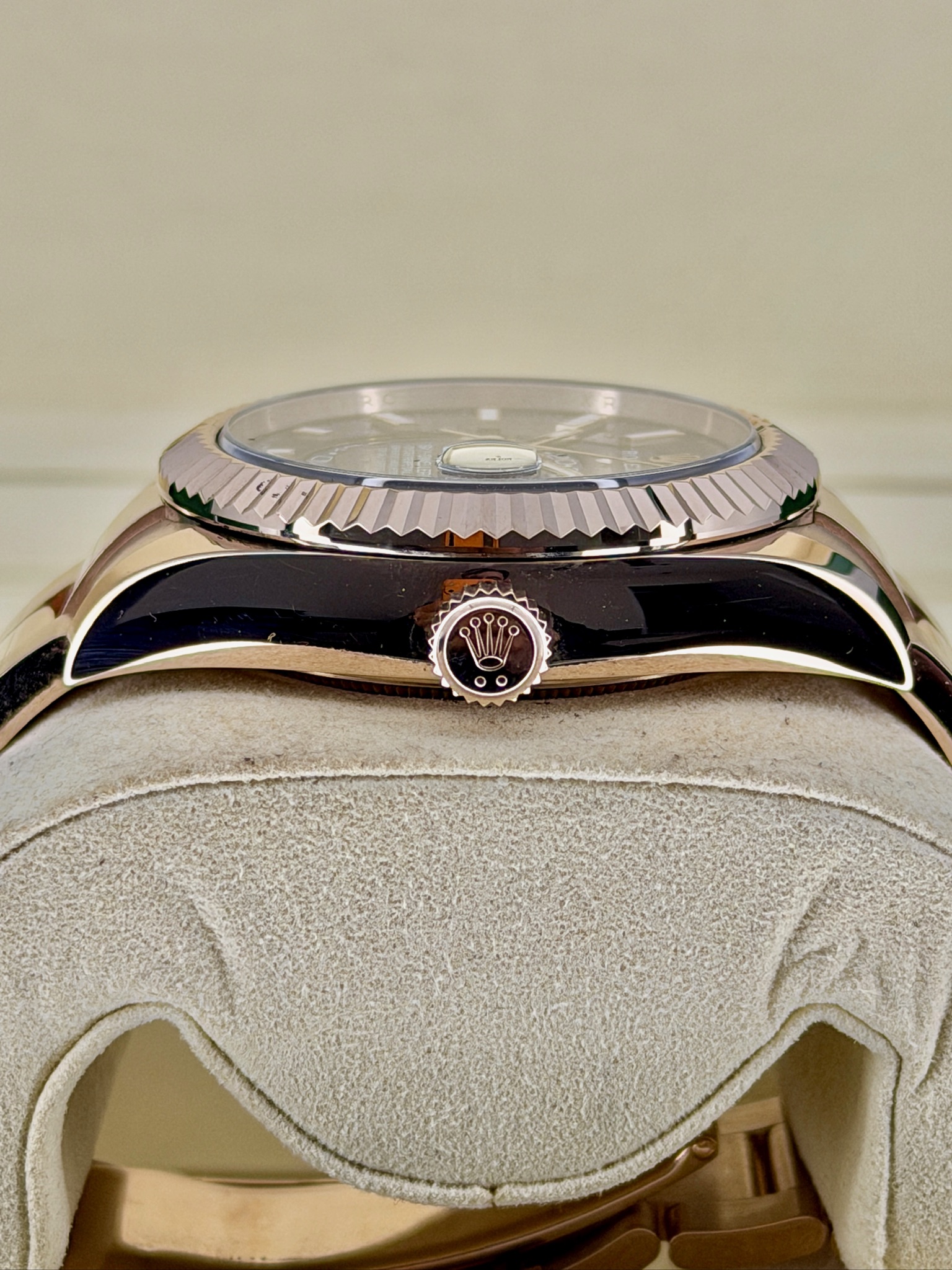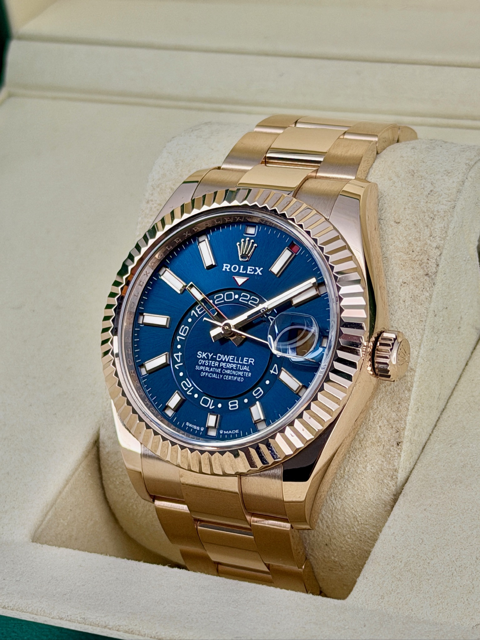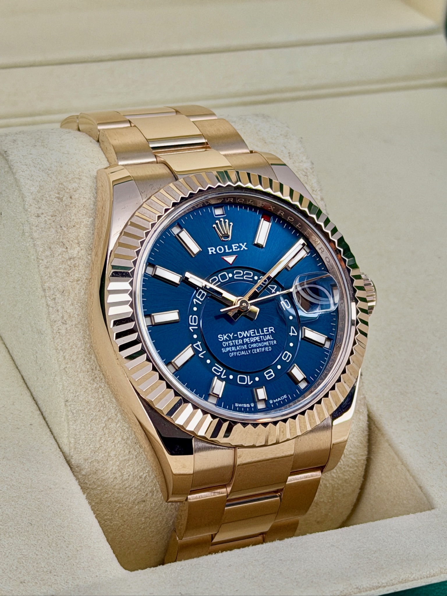 This pre-owned Rolex Sky-Dweller 336935 is a serious statement piece. Crafted in 18k Everose gold, it has that warm, rich tone that really stands out without being over the top. What makes this watch special is the Sky-Dweller function—it lets you track a second time zone and features an annual calendar, all controlled through the bezel. It’s incredibly practical but still feels very luxurious. If you want a Rolex that combines innovation, prestige, and everyday wearability, this one checks all the boxes.