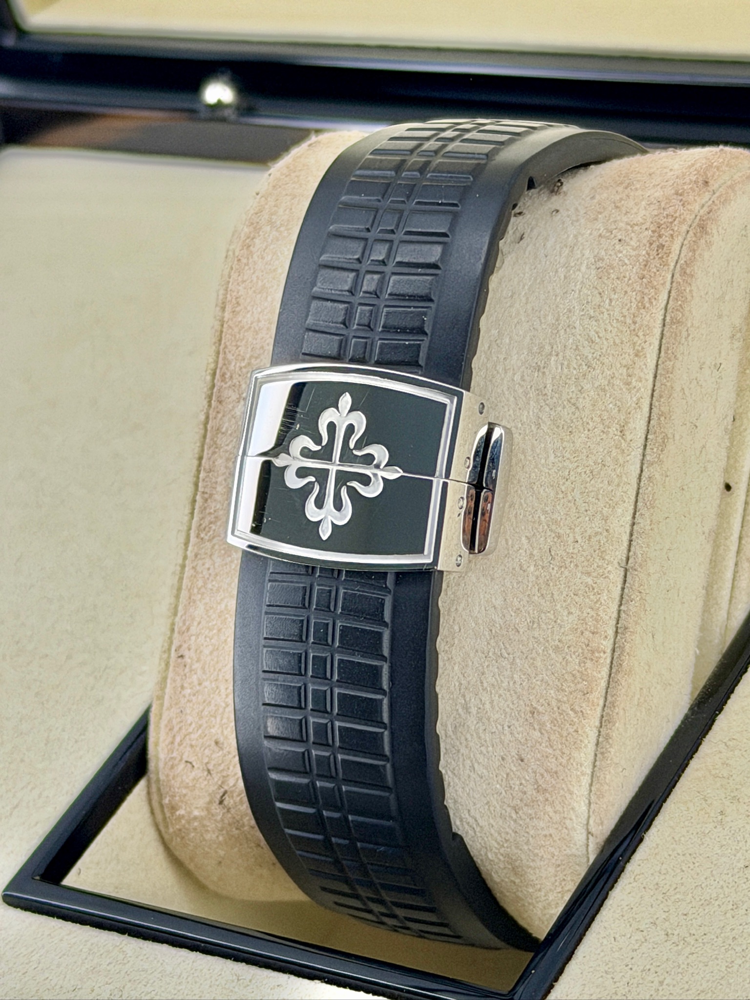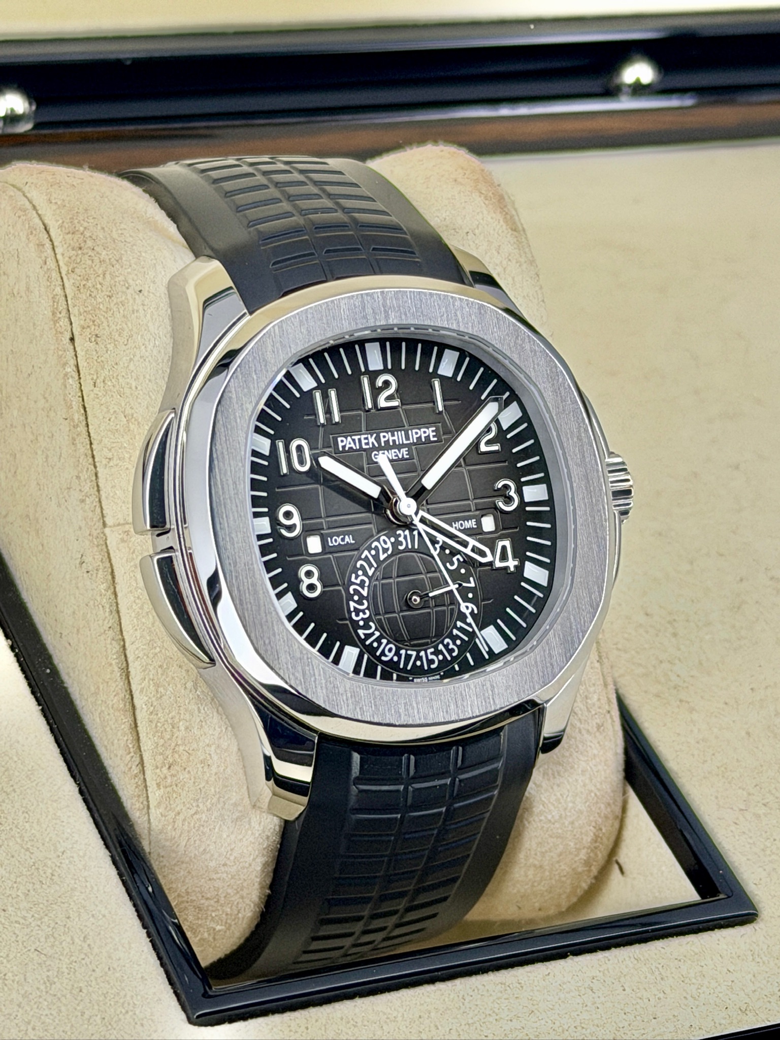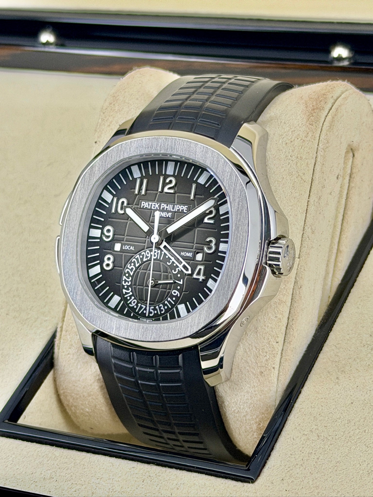 The Pre-Owned Patek Philippe Aquanaut 5164A Travel Time is a perfect blend of luxury, style, and practicality. Its stainless steel case and signature Aquanaut design give it a modern, sporty look that stands out without being flashy. The dual time function makes it ideal for frequent travelers, while the automatic movement ensures precision and reliability. The comfortable rubber strap adds a casual, wearable touch, making it perfect for everyday use. It’s a watch that’s functional, collectible, and effortlessly stylish—one that’s sure to turn heads wherever you go.